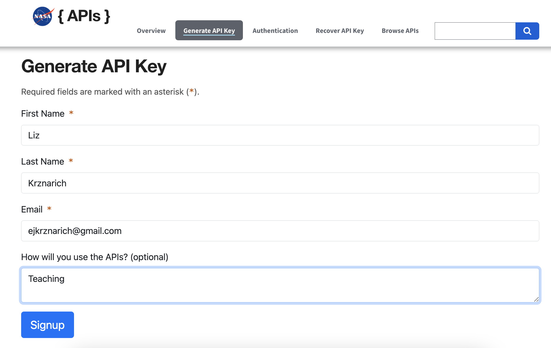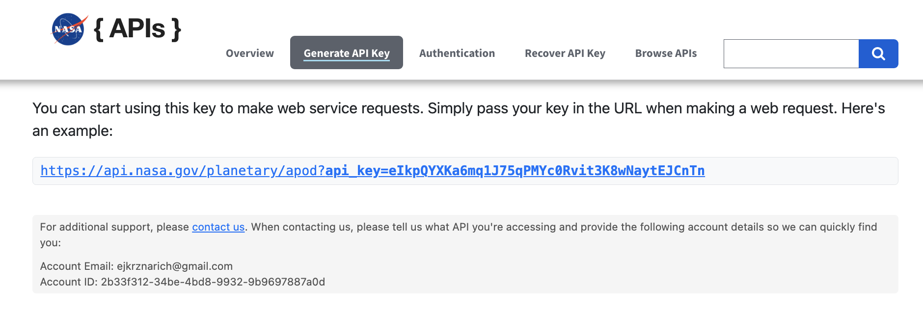 NASA posts an Astronomy Picture of the Day each day, which is also available via an API. To use this API, you first need to register for a key at https://api.nasa.gov