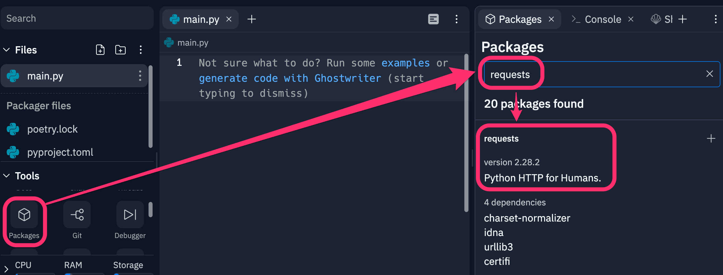 In Replit, install requests by clicking Tools > Packages, then searching for "requests"